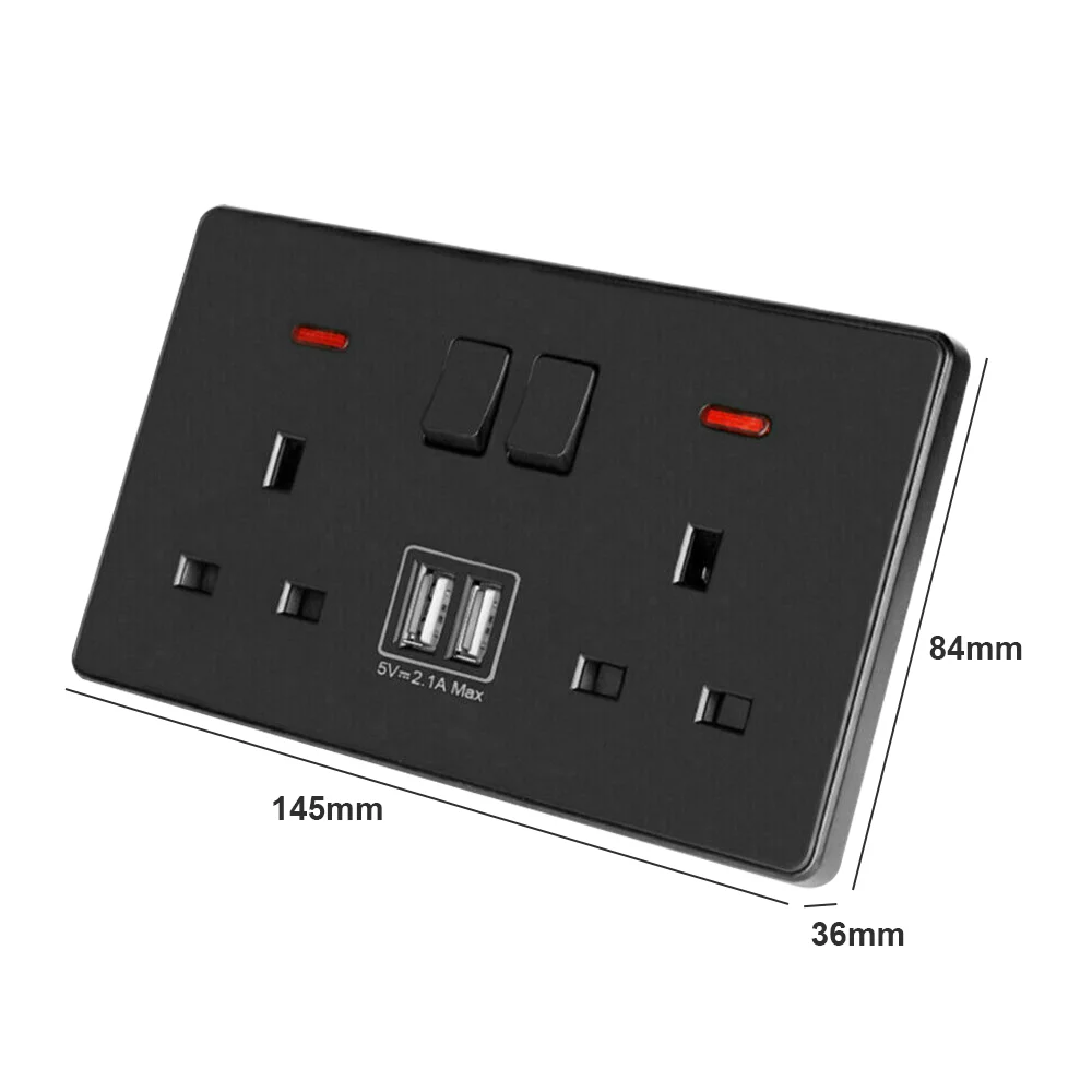 Features:*Made by fireproof PC material, high temperature resistant and safe to use.*Conductive carrier is used thick copper for good conductivity.*Easy to install and easy to use, power saving.*With UK plug so you can use it anywhere、anytime and easy to install.*Perfect for homes, offices and work places with a limited amount of wall plate.Description:This USB Wall plate provides two standard AC plug wall electrical outlet and 2 USB outlets for charging Cell Phones, Tablets, and USB devices etc.AC plug design, effectively avoid danger of electric shock.Specifications:Material: PC, CopperColor: White/ BlackVoltage: AC100-250V 13AUSB output parameter: DC 5V/2.1A(max)Each Package Included:1 x Rechargeable Wall UK Socket Plate2 x Screws