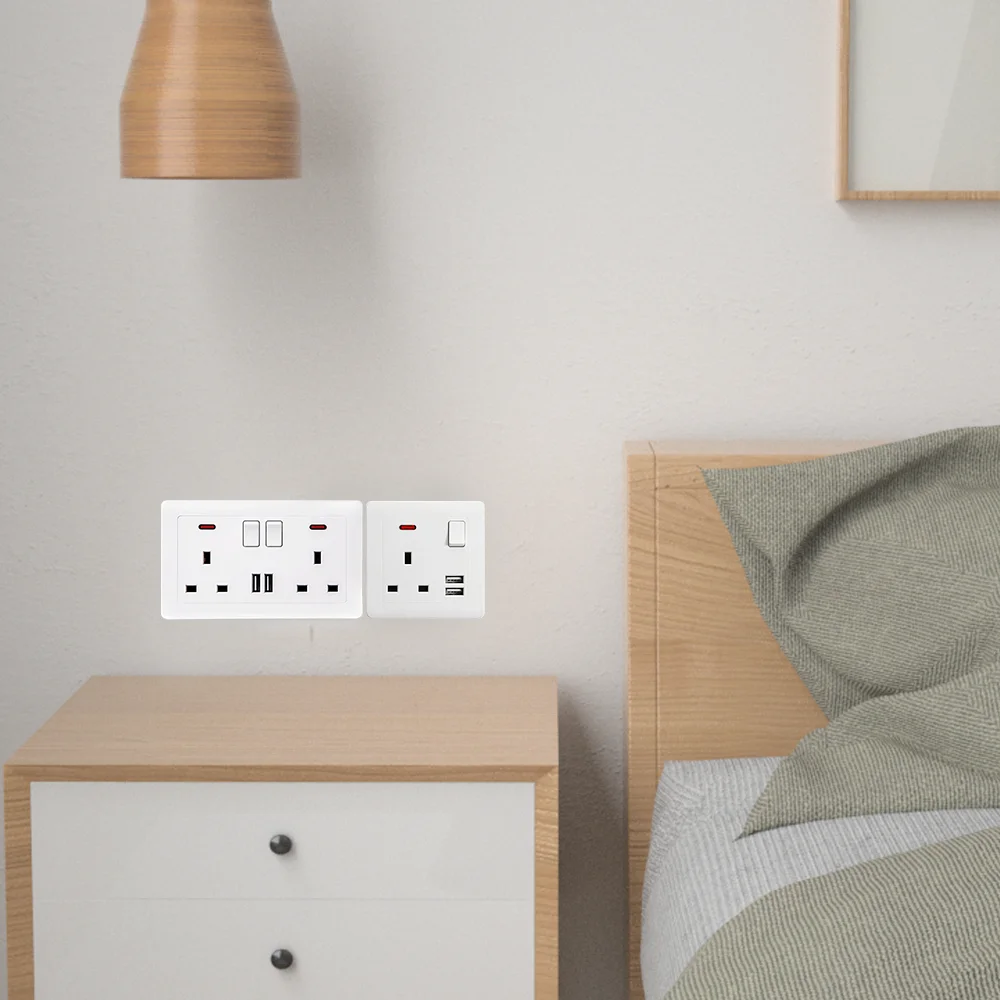 Dual-Wall Plug Socket, 2-Gang, 13A with 2 USB Charging Ports and Flat Plate – UK Standard