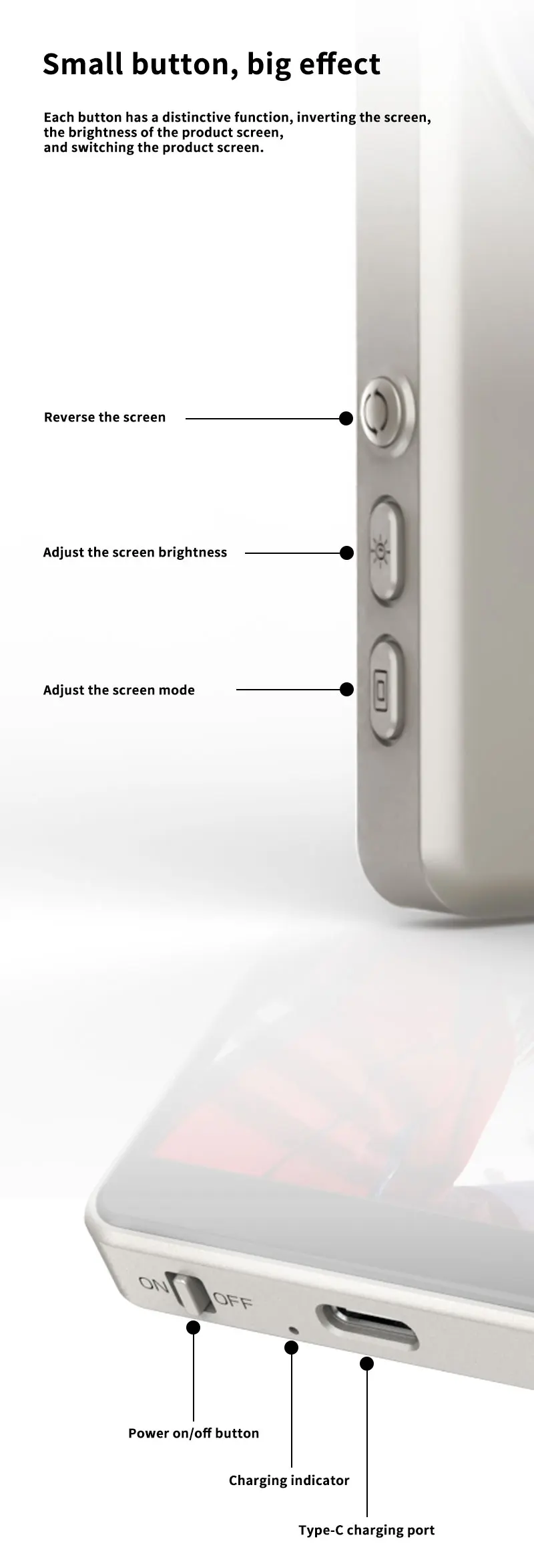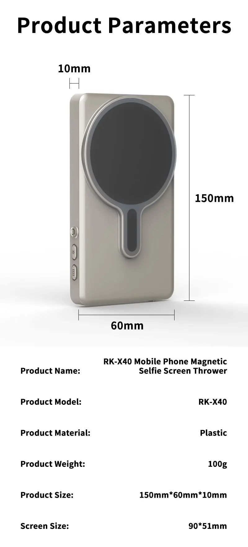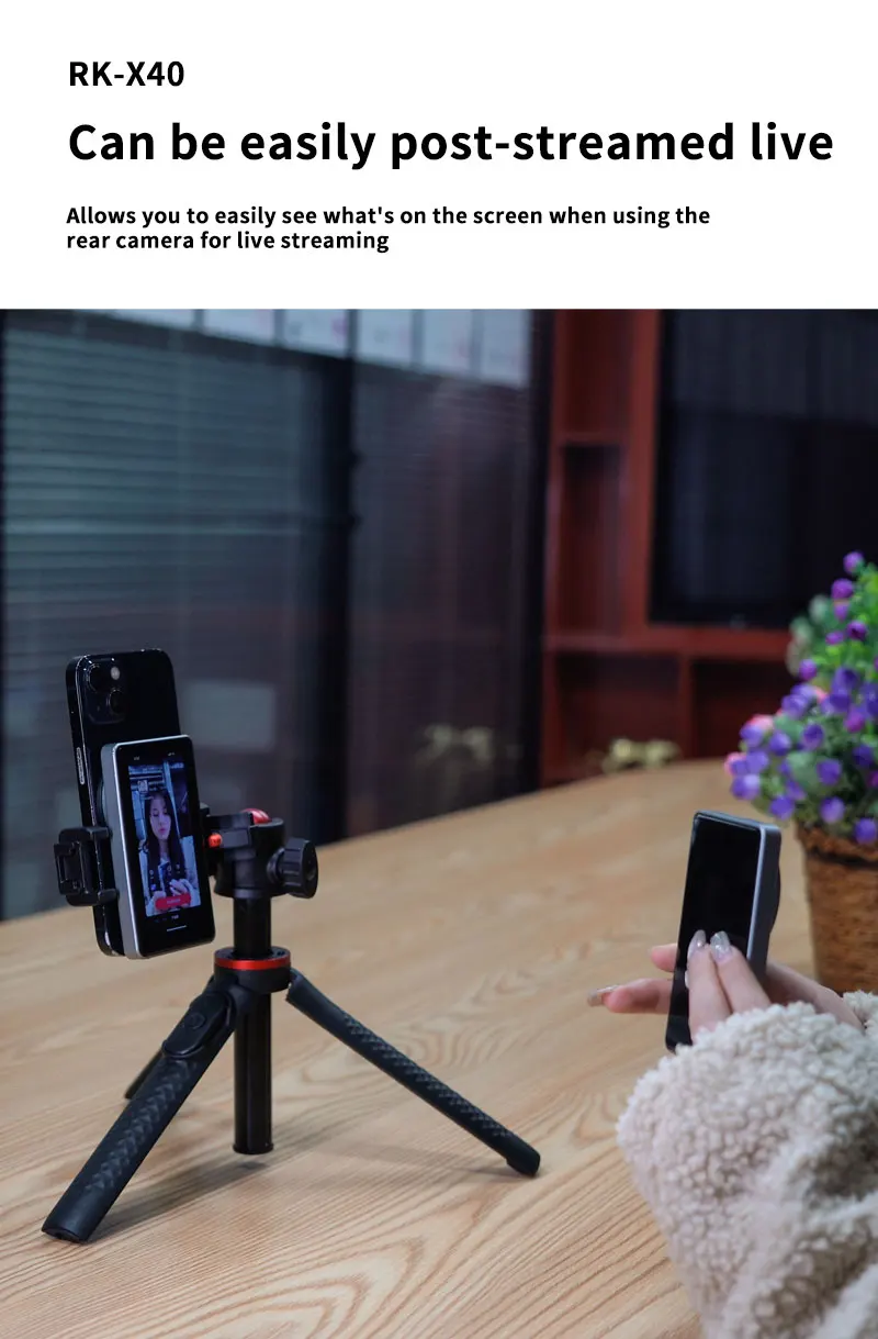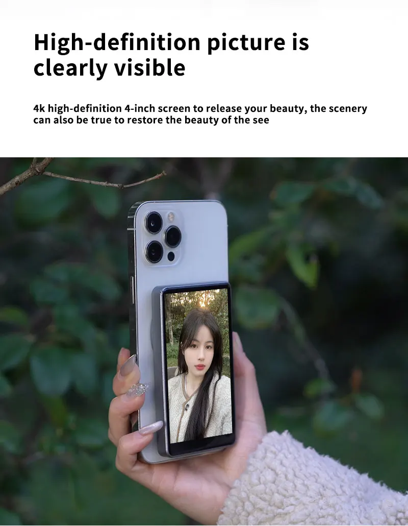 Description:Wide Angle Shots: Capture more in your photos with the adjustable position of the phone rear camera, for long-distance compositionEasy To Grasp: The selfie phone is designed for easy handling, allowing you to take beautiful clothing photos with easeAdjustable Position: The rear camera selfie phone allows you to control the display screen for Magsafe vlog shots effortlesslyIntelligently recognizes: The phone rear camera intelligently recognizes horizontal and vertical for vlog selfiesScreen Rotates Horizontally: The display screen rotates horizontally for quick image flipping, making vlogging a without disassemblySpecification:Color: As Shown.Material: ABS.Note:There might be a bit color distortions due to different computer resolutions.There might be a slight errors due to different hand measurement.Package Includes:Built in battery: 1500mAhPacking list: 1 * Selfie formonitor1 * Storage bag1 * Bluetooth remote control1 * USB charging cable