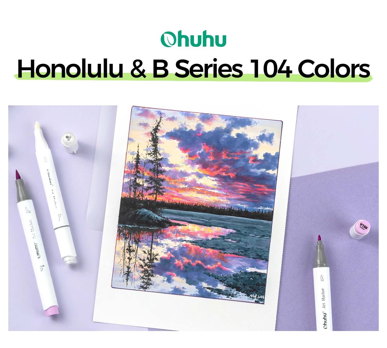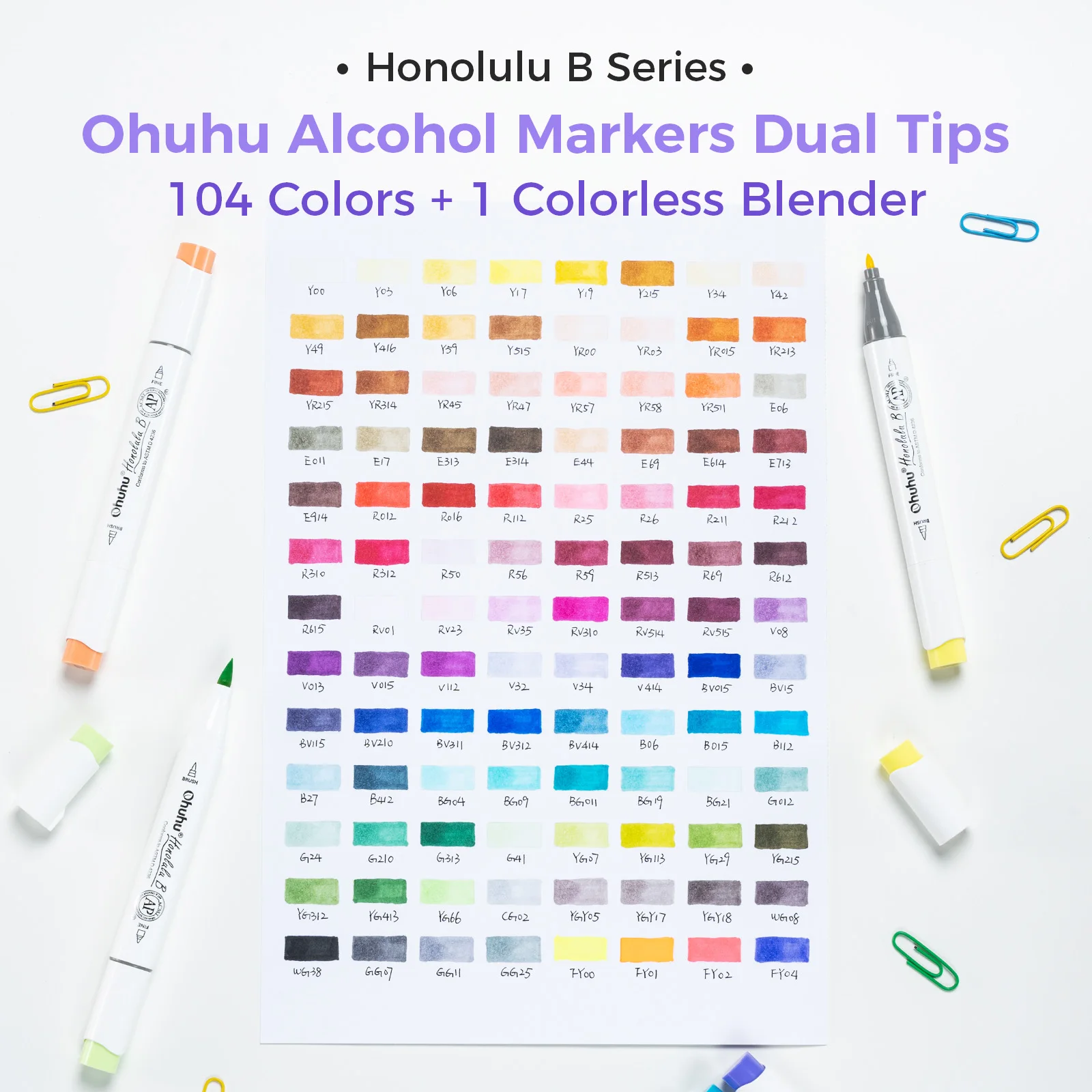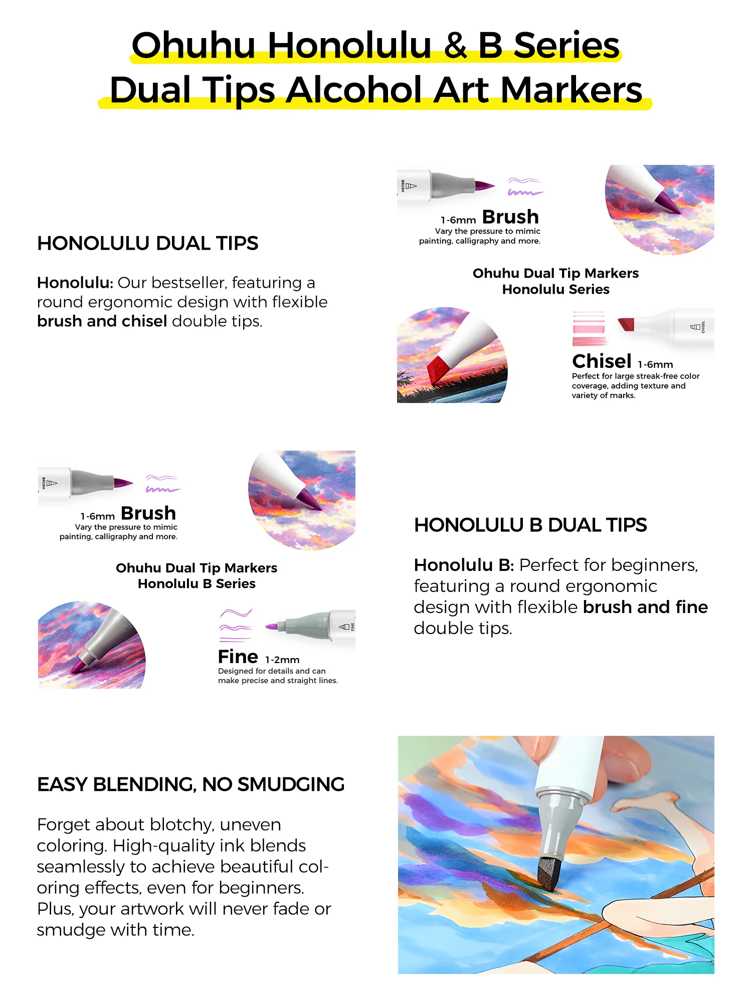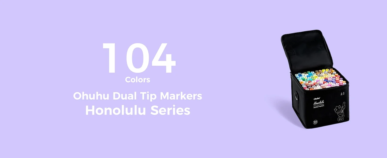 Main Featrues【Honolulu Series】BRUSH & CHISEL, DOUBLE-TIP, DOUBLE THE FUNWiden your artistic horizons with the dual-tip marker design! Choose the brush tip for sweeping, calligraphic strokes or quickly color in large areas with the wide chisel tip. What's more, now Ohuhu replacement brush tips is available, so you can easily replace the worn-out tips to ensure consistent and precise lines whenever you create. The only limit is your imagination【Honolulu B Series】BRUSH & FINE, DOUBLE-TIP, DOUBLE THE FUNWiden your artistic horizons with the dual-tip marker design! Choose the brush tip for sweeping, calligraphic strokes or the fine tip for details. What's more, now Ohuhu replacement brush tips is available, so you can easily replace the worn-out tips to ensure consistent and precise lines whenever you create. The only limit is your imaginationNEW 104-COLOR ART MARKERIf you already own the 216 colors set of Ohuhu Honolulu Series, it is suggested to purchase this New 104 colors set to expand your collections to 320 colors. The color spectrum is yours to explore with 104 brilliant shades to choose from, plus a colorless blender for better blending effects. From coloring books to professional masterpieces, our brush markers will breathe life into your artworkREFILLABLE INK FOR A LIFETIME OF CREATIVITYWith 51 Ohuhu popular colors available for refills now and more on the way, your creativity knows no bounds. Enjoy a wide range of hues and keep your markers going for years to come. Whether you're exploring the rich colors of Honolulu, Oahu, the Kaala, or the bold hues of Molokai Series, they are refillable now. Switch between sets seamlessly and unlock endless artistic possibilities SEAMLESSLY BLENDINGSay goodbye to unsightly splotches and uneven coloring. Our high-quality ink seamlessly blends to create beautiful, professional-grade artwork, perfect for both beginners and experienced artists; Also, no more frustrating smudges or wet ink ruining your work. Our alcohol-based ink dries quickly, ensuring that your art is always clean, crisp, smudge-free, and ready to display EASY IDENTIFICATION, ORGANIZATION & PORTABILITYDon't waste time searching for the perfect color. Our markers come with color-coded caps to keep you organized and efficient. Plus, the free carrying case makes these markers perfect for any coloring adventure or as a thoughtful gift for any artist Product Description