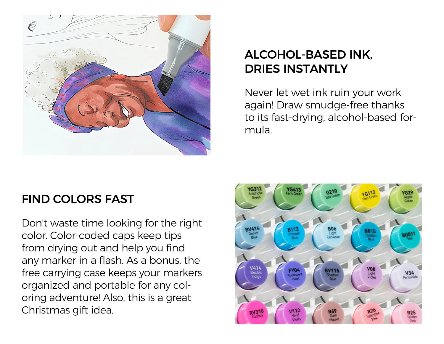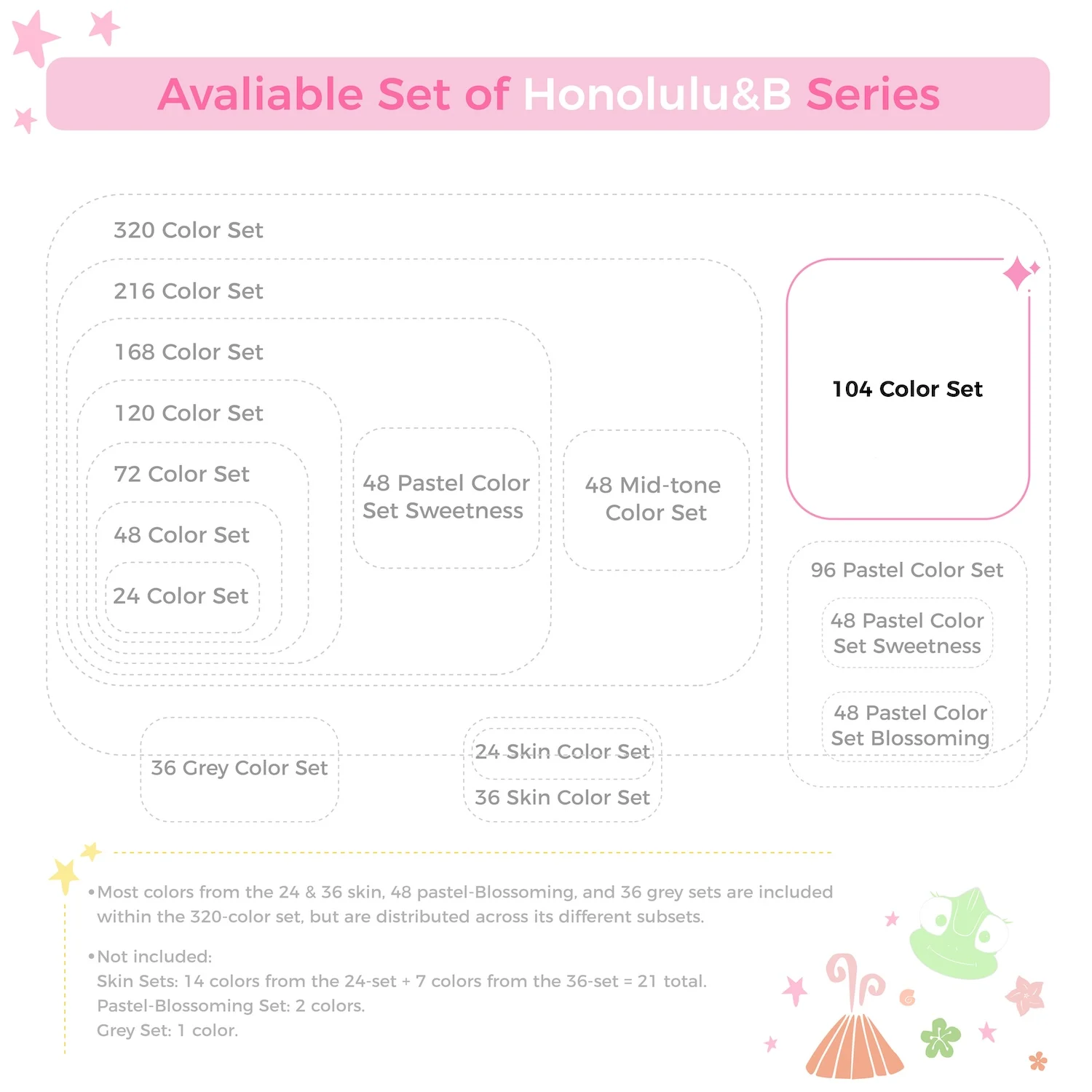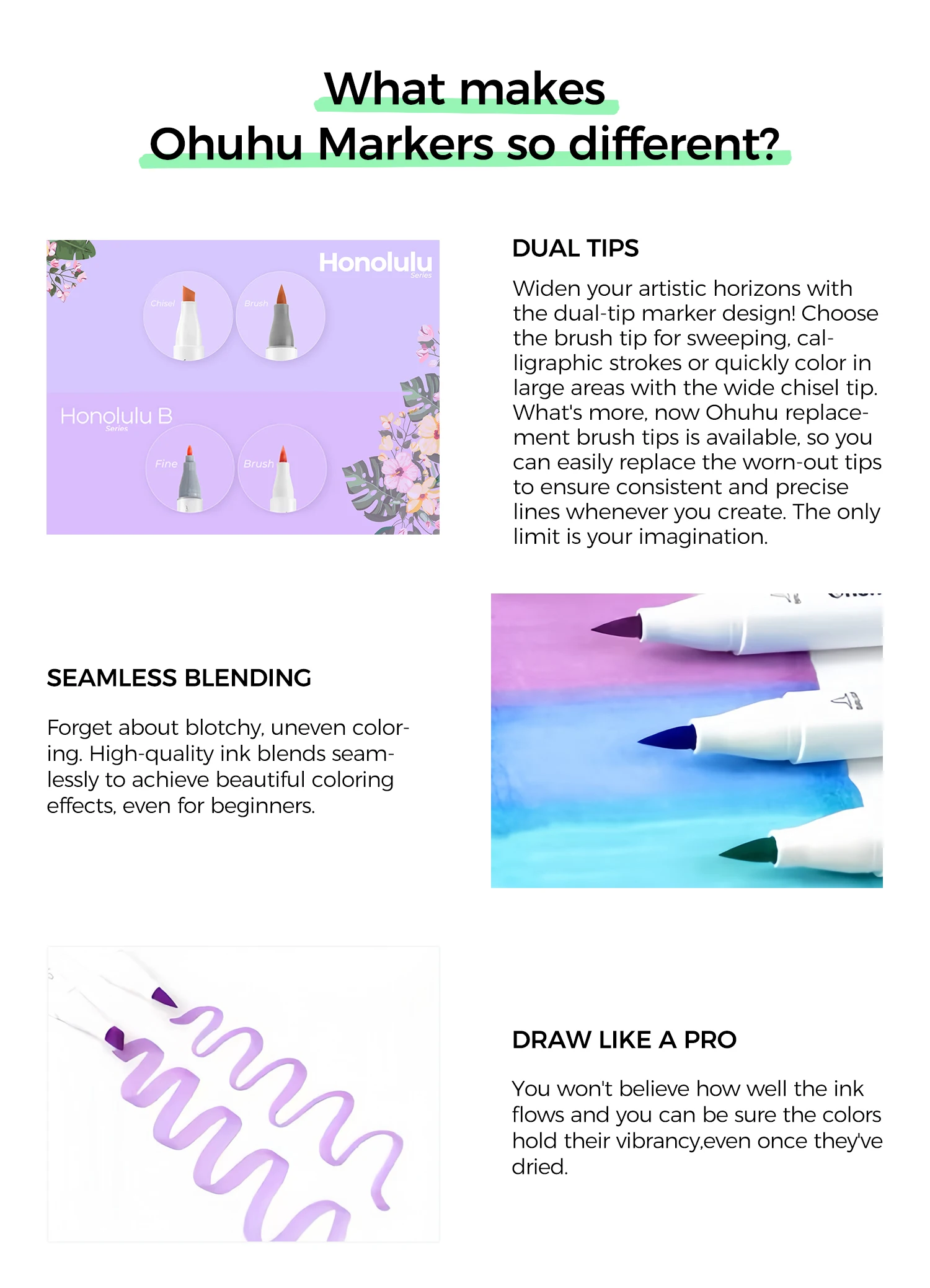 Main Featrues【Honolulu Series】BRUSH & CHISEL, DOUBLE-TIP, DOUBLE THE FUNWiden your artistic horizons with the dual-tip marker design! Choose the brush tip for sweeping, calligraphic strokes or quickly color in large areas with the wide chisel tip. What's more, now Ohuhu replacement brush tips is available, so you can easily replace the worn-out tips to ensure consistent and precise lines whenever you create. The only limit is your imagination【Honolulu B Series】BRUSH & FINE, DOUBLE-TIP, DOUBLE THE FUNWiden your artistic horizons with the dual-tip marker design! Choose the brush tip for sweeping, calligraphic strokes or the fine tip for details. What's more, now Ohuhu replacement brush tips is available, so you can easily replace the worn-out tips to ensure consistent and precise lines whenever you create. The only limit is your imaginationNEW 104-COLOR ART MARKERIf you already own the 216 colors set of Ohuhu Honolulu Series, it is suggested to purchase this New 104 colors set to expand your collections to 320 colors. The color spectrum is yours to explore with 104 brilliant shades to choose from, plus a colorless blender for better blending effects. From coloring books to professional masterpieces, our brush markers will breathe life into your artworkREFILLABLE INK FOR A LIFETIME OF CREATIVITYWith 51 Ohuhu popular colors available for refills now and more on the way, your creativity knows no bounds. Enjoy a wide range of hues and keep your markers going for years to come. Whether you're exploring the rich colors of Honolulu, Oahu, the Kaala, or the bold hues of Molokai Series, they are refillable now. Switch between sets seamlessly and unlock endless artistic possibilities SEAMLESSLY BLENDINGSay goodbye to unsightly splotches and uneven coloring. Our high-quality ink seamlessly blends to create beautiful, professional-grade artwork, perfect for both beginners and experienced artists; Also, no more frustrating smudges or wet ink ruining your work. Our alcohol-based ink dries quickly, ensuring that your art is always clean, crisp, smudge-free, and ready to display EASY IDENTIFICATION, ORGANIZATION & PORTABILITYDon't waste time searching for the perfect color. Our markers come with color-coded caps to keep you organized and efficient. Plus, the free carrying case makes these markers perfect for any coloring adventure or as a thoughtful gift for any artist Product Description
